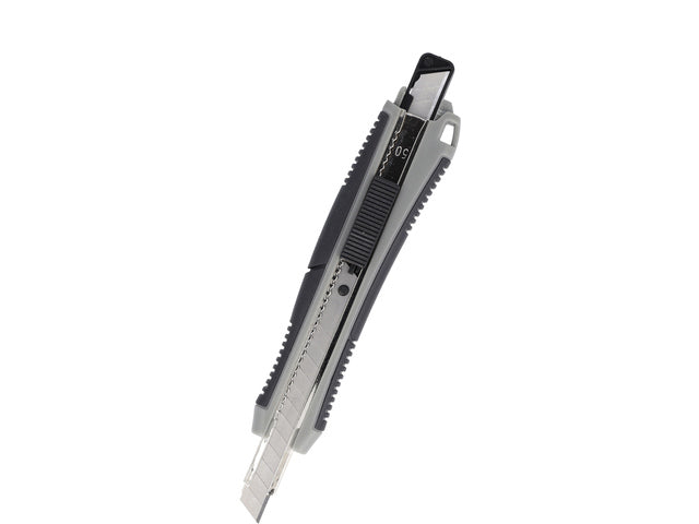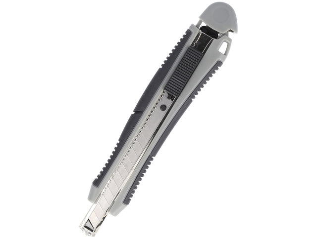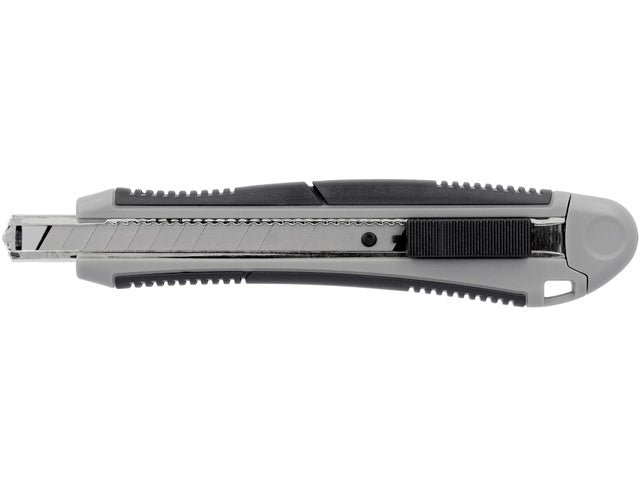 Snijmes met 9 mm snijblad in grijs/zwarte kunststof houder voorzien van metalen geleiding, schuifsluiting en softgrip greep. Garantie: 5 jaar. Geleverd in full colour kartonnen blisterverpakking met europonsing.