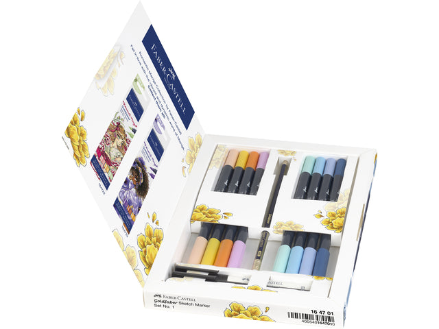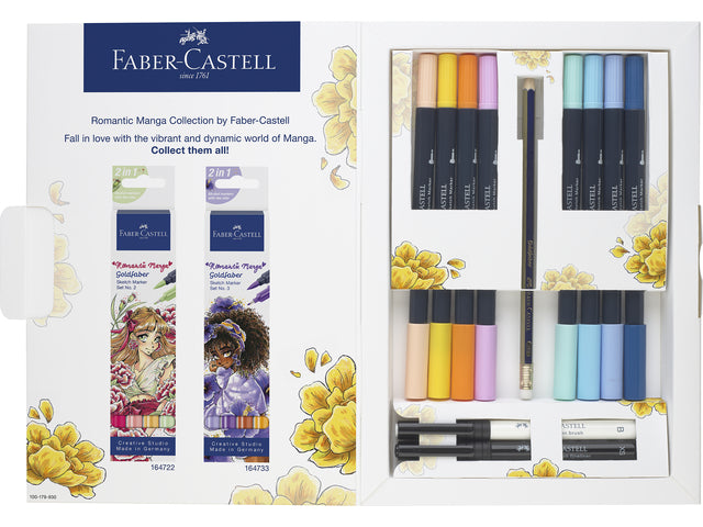 Deze creatieve set Romantic Manga Collection bevat alles wat je nodig hebt om meteen te beginnen met het tekenen van je personage. De Goldfaber sketchmarkers zijn op alcoholbasis en hebben sneldrogende inkt en twee verschillende penpunten (fineliner met metalen behuizing 0.6 mm en penseelpunt) voor een geweldige tekenervaring. De inkt is veegvast, waterbestendig en droogt snel. De doppen en de houders van de sketchmarkers zijn gemaakt van 100% gerecycled materiaal en kunnen kleurvariaties vertonen door de productie. Inhoud set: 8 Goldfaber sketchmarkers, 1 Pitt Artist Pen fineliner met punt XS = 0,1 mm (kleur 199 zwart), 1 Pitt Artist Pen met brushpunt B (kleur 101 wit), 1 Goldfaber grafietpotlood met gum (HB), 10 vellen markeerpapier A5, 1 instructieboekje met stap-voor-stap tekenhandleiding om de coverillustratie te tekenen plus 2 speciale mangastickers. Dompel jezelf onder in de wereld van romantische Manga!