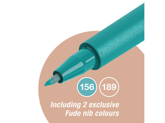 Faber-Castell heeft alle voordelen van kunstenaarsinkt gecombineerd met de voordelen van een moderne, gebruiksvriendelijke pen - de Pitt Artist Pen. Deze tekenstift met brushpunt is uitermate geschikt voor schetsen, studies, tekeningen, opschriften, ontwerpen en lay-outs. De hoogwaardige India-inkt pigmentering zorgt voor uitstekende kleurkracht en hoge lichtbestendigheid met goed inktvloed en gelijkmatige kleurafgifte. De inkt is zuurvrij, pH-neutraal, geurloos, watervast en permanent na droging en bloedt niet door het papier. In de set zitten 2 gekleurde Fude pennen. De Fude punt is vergelijkbaar met een penseelpunt maar is iets korter en soepeler. Inhoud giftset New York: 1x Pitt Artist Pen fineliner S = 0.3mm, 2x Fude pen FM kleurnr. 156, 189 en 9x Pitt Artist Pen Brush (B) kleurnr. 199, 177, 113, 134, 112, 172, 153, 146, 101 in bewaarblik.