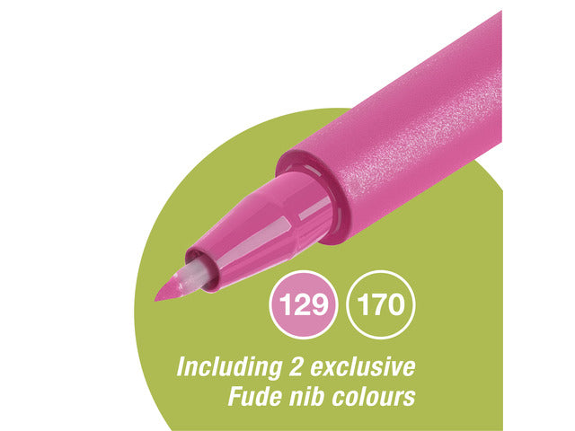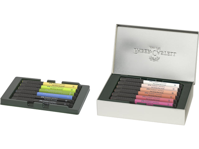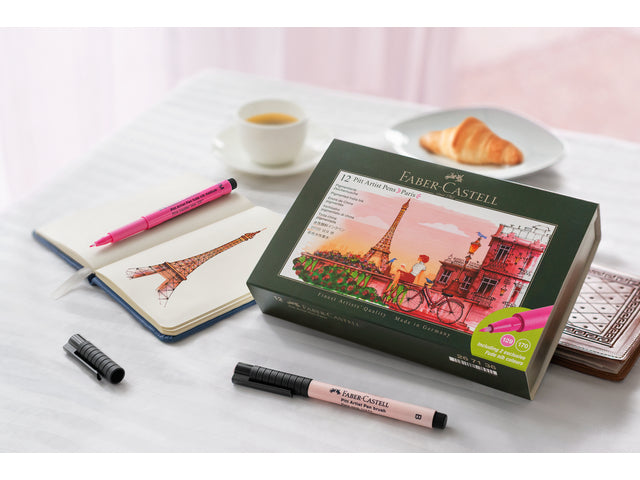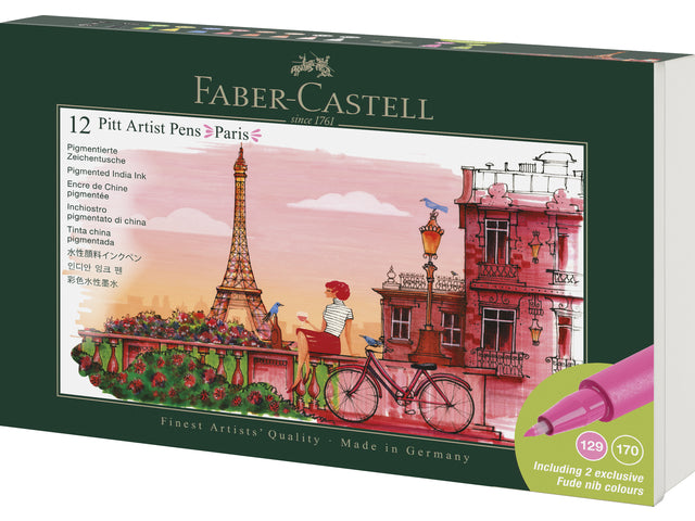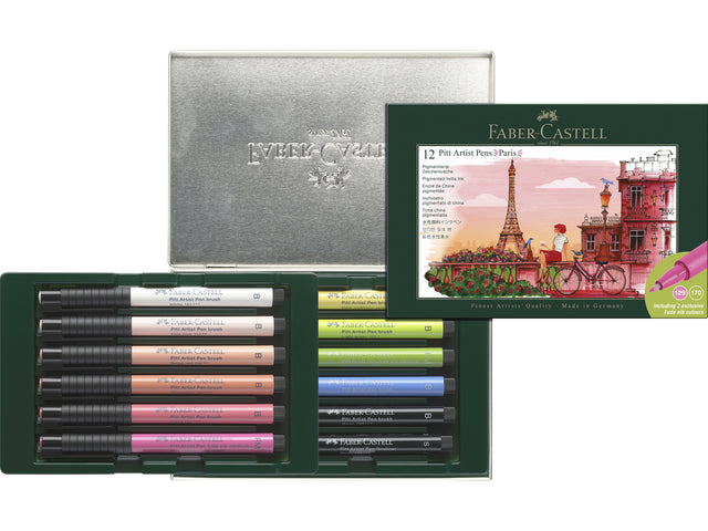 Faber-Castell heeft alle voordelen van kunstenaarsinkt gecombineerd met de voordelen van een moderne, gebruiksvriendelijke pen - de Pitt Artist Pen. Deze tekenstift met brushpunt is uitermate geschikt voor schetsen, studies, tekeningen, opschriften, ontwerpen en lay-outs. De hoogwaardige India-inkt pigmentering zorgt voor uitstekende kleurkracht en hoge lichtbestendigheid met goed inktvloed en gelijkmatige kleurafgifte. De inkt is zuurvrij, pH-neutraal, geurloos, watervast en permanent na droging en bloedt niet door het papier. In de set zitten 2 gekleurde Fude pennen. De Fude punt is vergelijkbaar met een penseelpunt maar is iets korter en soepeler. Inhoud giftset Paris: 1x Pitt Artist Pen fineliner S = 0.3mm, 2x Fude pen FM kleurnr. 129, 170 en 9x Pitt Artist Pen Brush (B) kleurnr. 199, 171, 108, 120, 131, 189, 132, 114, 101 in bewaarblik.