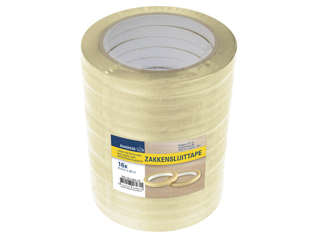 Zakkensluittape Raadhuis PP zelfklevende tape voor de zakkensluiter. Formaat 9 mm breed met 66 meter op de rol. Kleur transparant. Krimp a 16 rol.
