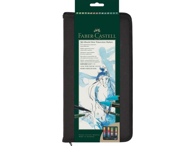 Deze Albrecht Dürer aquarelmarkers op waterbasis zijn de moderne definitie van aquarelleren, een hoge kwaliteit tekeninstrument dat zowel spontaan schetsen als aquarelleren ondersteunt. De inkt op waterbasis is altijd klaar voor gebruik en is uitstekend bruikbaar in combinatie met water. Kwaliteit is één van Faber-Castell haar belangrijkste punten, dus deze aquarelmarker valt op door de hoge pigmentatie en hoge lichtechtheid. De kleuren volgen het Faber-Castell kleurnummeringssysteem en kunnen daarom op betrouwbare wijze gecombineerd worden met de potloden en Pitt artist pennen van Faber-Castell. Het grote voordeel van deze markers is dat de inkt niet doordrukt op het papier, bij alcohol markers gebeurt dit namelijk wel. Het product komt het beste tot zijn recht als je gebruik maakt van aquarelpapier. De marker heeft twee penpunten: Een penseelpunt en een vezelpunt, dit biedt de kunstenaar veel flexibiliteit in de persoonlijke tekenstijl. De penseelpunt is zacht en flexibel en door de richting van de punt op het papier te veranderen kan je met lijndiktes eindeloos variëren. De vezelpunt is uitermate geschikt voor wat meer gedetailleerd werk, de lijndikte is 1-2mm afhankelijk van de tekenhoek. Deze Albrecht Dürer aquarelmarkers zijn verkrijgbaar in 30 verschillende kleuren. Deze set is alles wat je nodig hebt, deze set bevat alle kleuren en accessoires die je nodig hebt om aan de slag te gaan. Inhoud etui: 30 stuks aquarelmarkers (alle kleuren), 4 Pitt artist pennen ( XS, S, 1.5, B), een perfect pencil 9000 potlood en een waterpenseel.