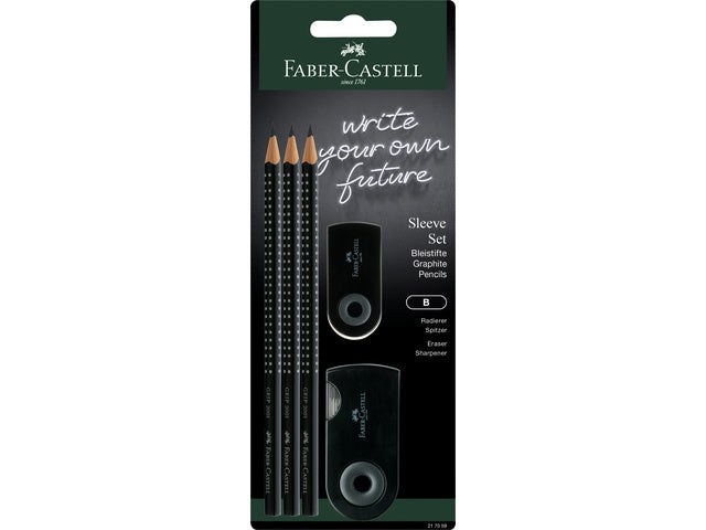 Schrijf je eigen toekomst met deze Sleeve set helemaal in stoer zwart! Deze set bevat 3 grafietpotloden welke ergonomisch gevormd zijn door zijn driekantige vorm en ze bevatten een soft-grip zone met antislip laag. De potloden zijn voorzien van de speciale SV verbinding waardoor het breken van de stift wordt voorkomen. Hardheid: B. Ook heeft deze set een gum in de vorm van een potlood, in dezelfde ergonomische vorm als de potloden. Deze gum zorgt voor vlekvrij gummen en is PVC-vrij. Uiteraard mag de puntenslijper in deze set niet ontbreken dus deze is ook toegevoegd, deze slijper is geschikt voor kleur- en grafietpotloden. De slijper heeft 3 openingen om te slijpen ( voor grip, jumbo en standaard potloden). Ook is de slijper voorzien van opvangbakje om het slijpsel in op te vangen. Kortom een zeer complete set en zeker een toegevoegde waarde aan je schoolspullen.