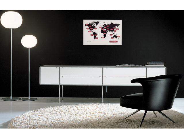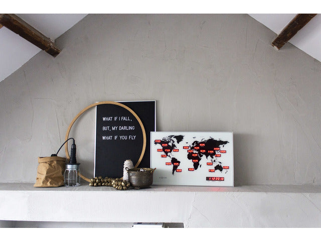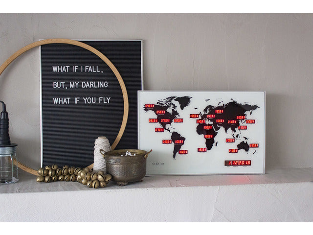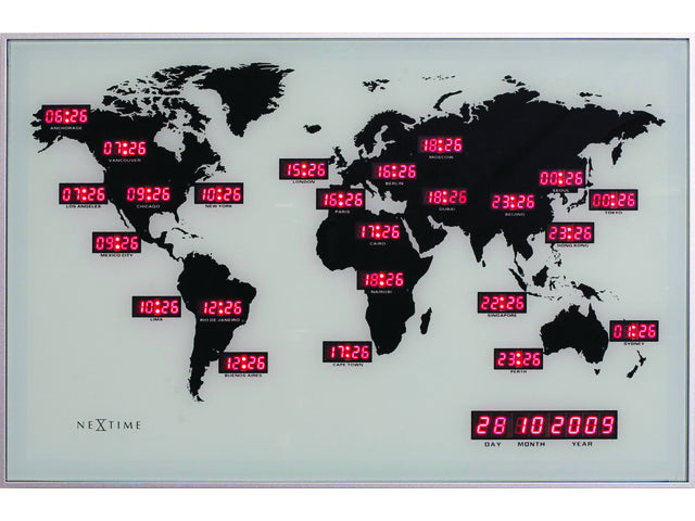 De NeXtime World Time Digit wandklok is een digitale klok met aluminium rand en een wit gematteerde glasplaat waarop een wereldkaart is bedrukt. Met behulp van rode LED verlichting wordt de tijd aangeduid voor 22 verschillende wereldsteden. Indien de zomer- of wintertijd ingaat kunt u eenvoudig de tijd bedienen voor het tijdvak Londen, en veranderen de overige tijden automatisch mee. Deze klok werkt op netstroom. Reist u veel of doet u veel zaken in het buitenland' Dan is dit een ideale klok voor aan de wand in uw huis of op kantoor. Afm. 55x36cm