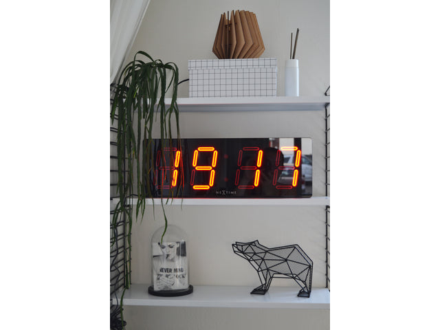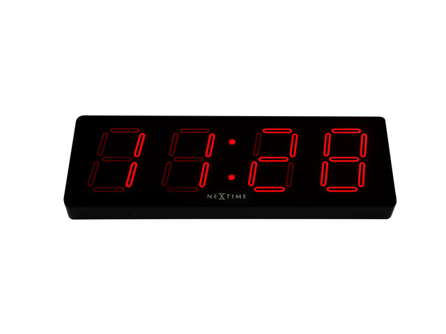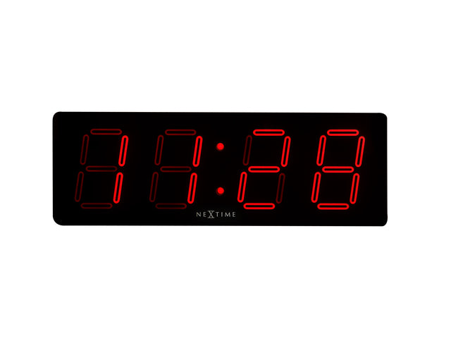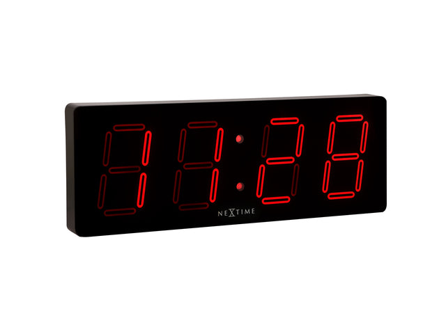 De NeXtime Big D wandklok heeft een zwarte kunststof behuizing, een zwarte glasplaat en rode LED verlichting. Dit maakt deze klok een goede keuze voor grote ruimtes. Door zijn afmetingen is de tijd vanaf tientallen meters afstand leesbaar en is deze klok een ware blikvanger. Ideaal voor scholen en openbare gebouwen! Deze klok werkt op netstroom. Afm. 51.5x18cm
