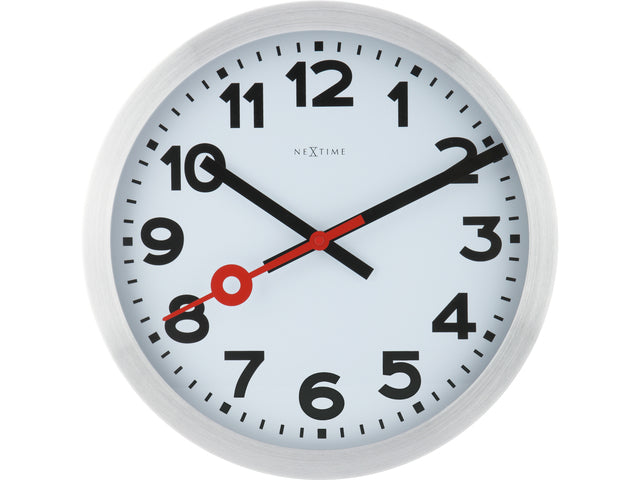 De NeXtime wandklok Station is een favoriet bij velen klok liefhebbers. De klok combineert een bekend en traditioneel ontwerp met de NeXtime stijl. De klok heeft een aluminium rand met een witte wijzerplaat en transparant kunststof voorplaat. De cijfers geven de uuraanduiding aan. De rood/oranje secondewijzer loopt geleidelijk rond, waardoor de klok geluidloos is. Ook verkrijgbaar in een uuraanduiding met strepen.