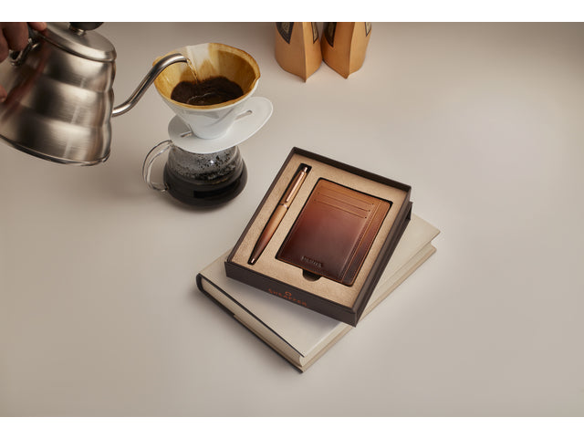 Sheaffer giftset balpen VFM E9428 en creditcardhouder. Balpen in licht koffiebruin kleurverloop met een matte textuur en koffiebruin gecoat PVD afwerking garandeert een nauwkeurig en betrouwbaar schrijfcomfort. Inclusief een universeel standaard Sheaffer medium balpenvulling in zwart. De populaire Sheaffer balpen VFM maakt indruk met zijn moderne, taps toelopende silhouet en is een combinatie van moderne elegantie en de hoogste kwaliteit. Deze Coffee Edition is perfect voor dagelijks gebruik en ontworpen voor koffieliefhebbers die graag met woorden spelen. De pen heeft een exclusief insigne op de achterkant van de pen. De wereldwijd erkende witte Sheaffer stip, die symbool staat voor schrijfexcellentie, kwaliteit en prestige, is terug te vinden op de clip. De balpen en creditcardhouder worden geleverd in mooie geschenkdoos.